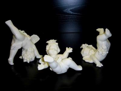 3 engeltjes. Verpakt per 3 verschillende in doosje Afmetingen: 8 cm Hoog wit Porselein 10 doosjes voor 15 euro
